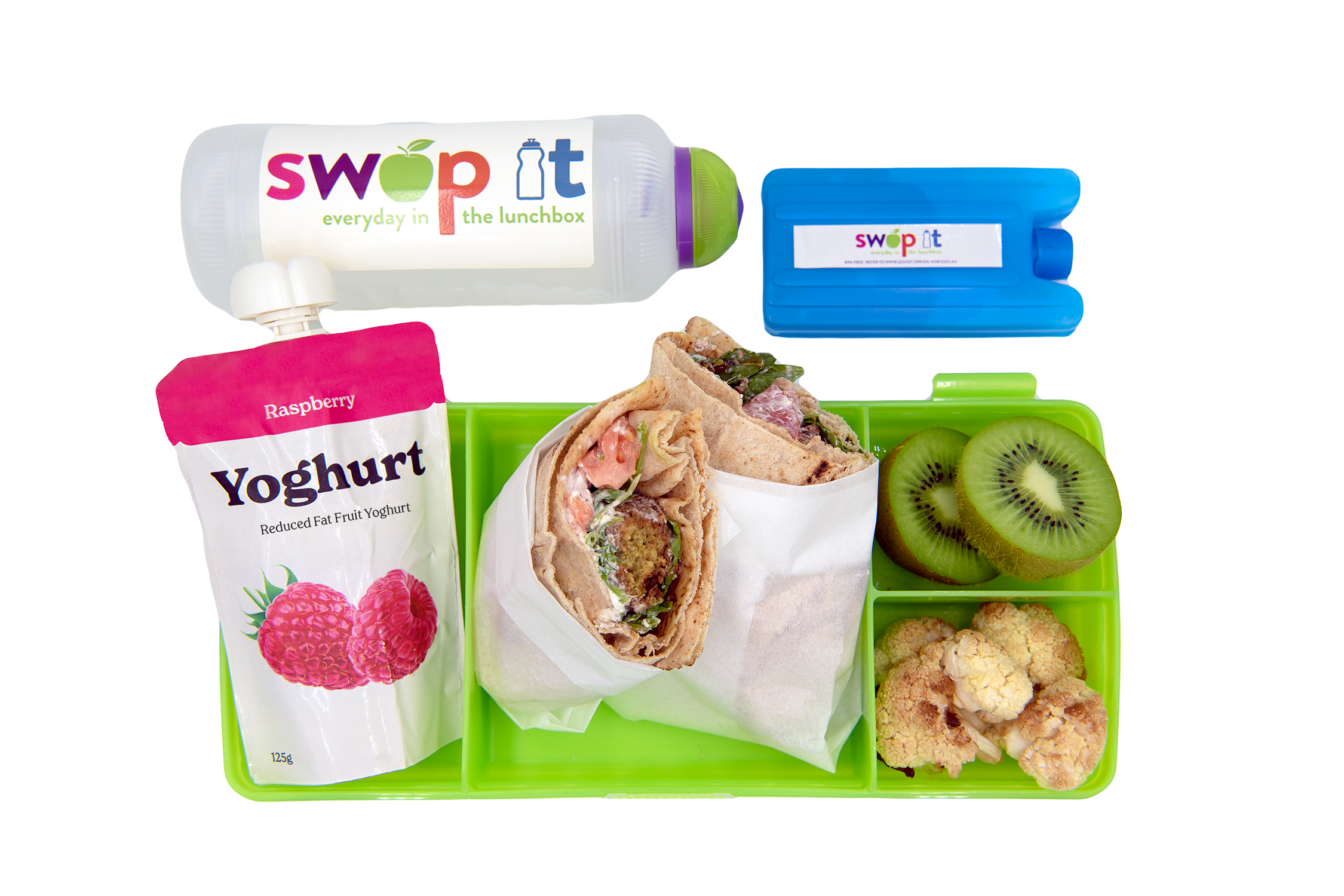 Lunch: Wholemeal wrap with falafel, labneh, baby spinach and tomato